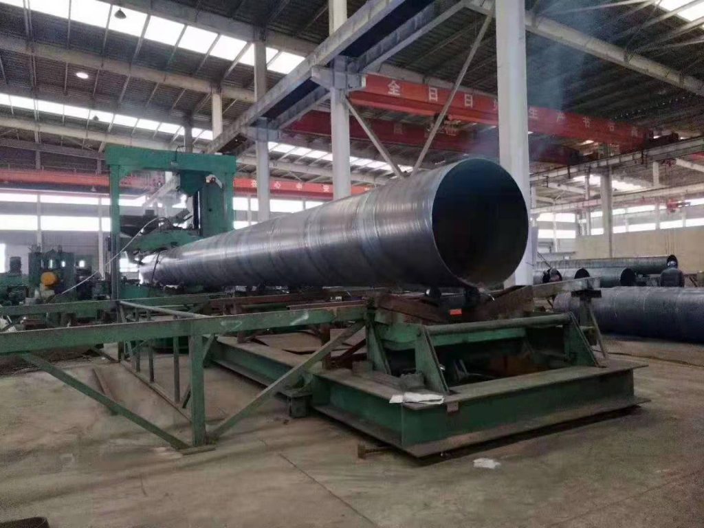 螺旋鋼管內焊和外焊均采用美國林肯電焊機進行單絲或雙絲埋弧焊接,從而獲得穩定的焊接規范。采用空氣等離子切割機將鋼管切成單根。焊完的焊縫均經過在線連續超聲波自動傷儀檢查,保證了100百分之的螺旋焊縫的無損檢測覆蓋率。若有缺陷,自動并噴涂標記,生產工人依此隨時調整工藝參數,及時缺陷。切成單根鋼管后,每批鋼管頭三根要進行嚴格的首檢制度,檢查焊縫的化學成份,溶合狀況,鋼管表面質量以及經過無損探傷檢驗,確保制管工藝合格。焊縫上有連續聲波探傷標記的部位,經過手動超聲波和X射線復查,如確有缺陷,經過修補后,再次經過無損檢驗,直到確認缺陷已經。螺旋鋼管焊縫呈螺旋線分布,焊縫長,尤其是處于動態條件下焊接時,焊縫還來不及冷卻就離開了成型點,極易產生焊接熱裂紋。裂紋的方向和焊縫平行,和鋼管軸線成一定夾角,一般在30-70°之間。